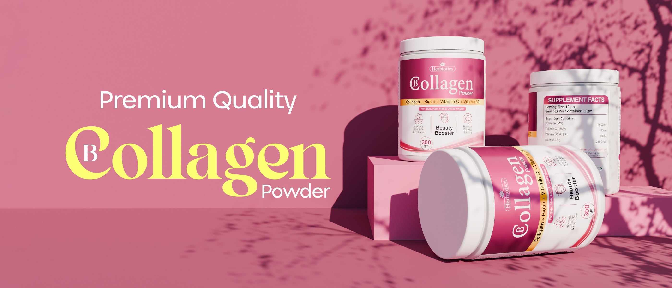 Herbiotics BCollagen Powder contains Hydrolyzed Collagen with the added benefits of Biotin, Vitamin C & D.